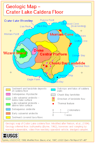 - ↑ Charles R. Bacon, James V. Gardner, Larry A. Mayer, Mark W. Buktenica, Peter Dartnell, David W. Ramsey, Joel E. Robinson (2002) Morphology, volcanism, and mass wasting in Crater Lake, Oregon, Geological Society of America Bulletin v. 114, pp. 675-692.