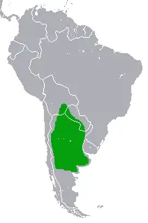 Habita el sudeste de Bolivia,[3] el oeste del Paraguay, y el norte y centro de la Argentina hasta el norte de la Patagonia.[4]