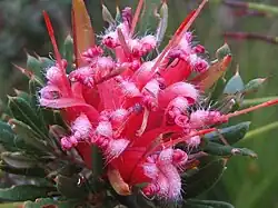 Crece como un arbusto que alcanza los 2 m de altura, con uno o más tallos derivados de una base leñosa conocida como un lignotubérculo. El nuevo crecimiento está cubierto con un pelo fino pardusco. Las hojas rígidas están dispuestas en verticilos de 3, 4 o 6, en los tallos, y son lineales a estrechas oblanceoladas. Miden de 1 a 8 cm de longitud y 0,2-0,7 cm de ancho, tienen una punta puntiaguda o vértice. Las flores se ven en cualquier época del año, pero más a menudo durante la primavera y el verano (septiembre a enero). Las inflorescencias están formadas por siete pequeñas flores individuales, conocidas como floretes, y pueden ser de tonos de color rojo o rosa. Los periantos son de 4,5 cm de largo, con los estilos que sobresalen otros 1-1,5 cm. La floración es seguida por el desarrollo de frutas que tienen dos (1 cm a 1,5 cm) protuberancias córneas afiladas.[2]