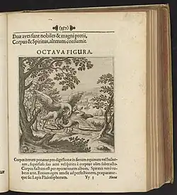 Un pájaro blanco y otro rojo luchan en un bosque, uno abajo y otro arriba; el verso relacionado habla de la transformación en palomas blancas y la unión en un fénix. | «Aquí hay dos pájaros grandes y fuertes, el cuerpo y el espíritu. Una devora al otro y es necesario que así lo hagan. De nuevo, el cuerpo será colocado en el estiércol de caballo o en el baño para ser digerido por su aire propagado o por el espíritu separado previamente del cuerpo. El cuerpo se vuelve blanco por el trabajo, verdaderamente el espíritu se vuelve rojo por el arte. La obra tiende a la perfección de su naturaleza y así es preparada la piedra de los filósofos.» |