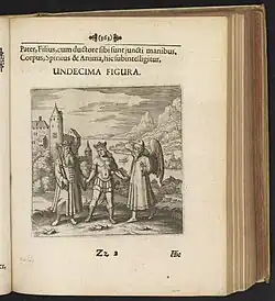 Un rey anciano (izquierda), un joven príncipe (centro, con la cabeza inclinada hacia su padre) y un líder espiritual barbudo y alado (derecha) se dan la mano. Al fondo un río, a la izquierda un pueblo y a la derecha montañas. El príncipe simboliza al adepto (alquimista) en su camino hacia la perfección. | «Padre, hijo y guía se toman de las manos. Comprendemos aquí el cuerpo, el espíritu y el alma.» |