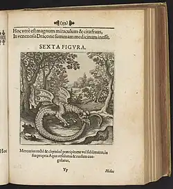 Un dragón que se muerde la cola (el antiguo símbolo de Ourobouros). | «Es con certeza un gran milagro y una extraña artimaña que en un dragón venenoso esté la medicina suprema. El mercurio, convenientemente y alquímicamente precipitado o sublimado, disuelto en su propia agua y coagulado inmediatamente.» |