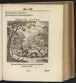 Un león levantando la pata derecha y una leona levantando la pata izquierda uno al lado del otro en un bosque (contraste hombre-mujer). | «Bien puede ser un gran milagro que estos dos leones se hagan uno sólo. El espíritu y el alma conjuntos, han de ser llevados a su cuerpo.» |