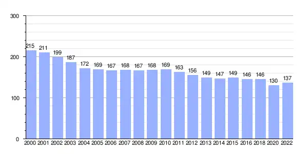 | Gráfica de evolución demográfica de Landoy entre 2000 y 2022 |