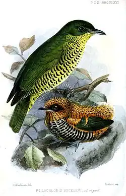 - ↑ a b Sclater, P.L.; Salvin, O. (1880). «On the Birds collected by Mr. C. Buckley in Eastern Equador». Proceedings of the Zoological Society of London (en inglés y latín). Pt.2: 155–160. Ptilochloris buckleyi p. 158; pl. 16. Disponible en Biodiversitas Heritage Library. ISSN 0370-2774.