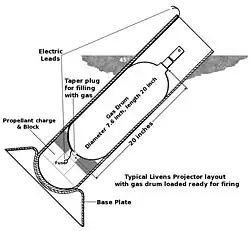 El lanzador Livens fue diseñado para combinar las ventajas de los cilindros de gas venenoso y los obuses químicos, al disparar un cilindro de gas contra el enemigo.[21] Consistía en un sencillo tubo de metal que era enterrado en un ángulo de 45°.