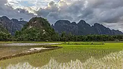 Arrozales verdes y montañas kársticas al atardecer con nubes en Vang Vieng en Laos