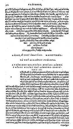 - Texto inglés con índice electrónico en el Proyecto Perseus. En la parte superior derecha se encuentran los rótulos activos "focus" (para cambiar al texto griego) y "load" (para el texto bilingüe).