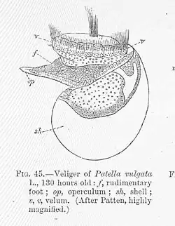 La larva veliger es su segunda forma larval, sucede después de la larva trocófora, y usualmente posee opérculo para cerrar su concha embrionaria, la cual se pierde en el adulto.[3] La mayoría suprimen el periodo de larva trocófora o lo atraviesan rápidamente, en muchos grupos los embriones eclosionan como larva veliger. Casi todos los pulmonados y muchos caenogastropoda tienen desarrollo directo, y la etapa de veliger se pasa en el huevo.[2]