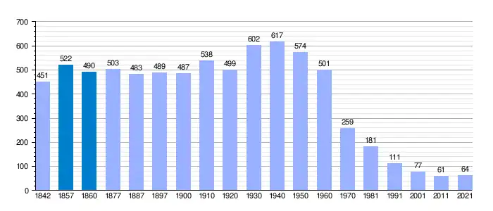 | Gráfica de evolución demográfica de Las Casas del Conde[17] entre 1842 y 2021 |