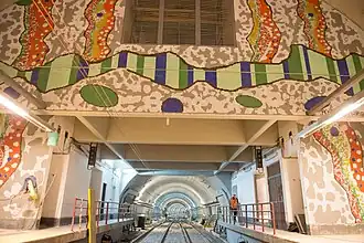 Los andenes, en sus extremos, están decorados con murales en tonalidades naranja, verde y azul. El acceso a los andenes tiene un mural con la imagen de Hugo del Carril realizado por el artista plástico Marino Santa María como parte del paseo cultural del tango. Ocupa una superficie de 500 metros cuadrados y para hacerse se utilizó un millón de venecitas.[8][9][10]