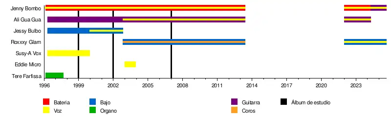 La alineación se completaría en 1996 y 1997 con la integración Suzy-A Vox (Susana Vargas) como vocalista principal para suplir a su hermana Mónica y poco después Ali Gua Gua inicialmente conocida como Ali Wah-Wah (Ali Gardoqui De la Reguera) en la guitarra quien formaba parte del grupo "Las Monas" (junto a la australiana Therese Reeves) y quien fue invitada a la banda por Jessy Bulbo (a quien conoció en un recital de trova), Gua Gua acepta con la condición de que Jenny Bombo tocara la batería en la banda de Ali (Las Monas). Ali Wah Wah que es originaria de Veracruz , se encontraba en la Ciudad de México estudiando cinematografía y trabajando como asistente de sonido en películas y agencias de publicidad.