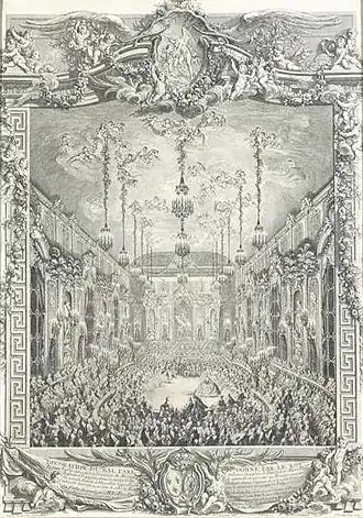 ![]() Decoración del baile dado por el rey el 24 de febrero de 1745, con ocasión del primer matrimonio del Delfín, en la misma sala construida en el picadero cubierto de la Grande Écurie (con dirección de M. de Bonneval) ¿1745?, Charles Nicolas COCHIN le Jeune (h. 1715-1790). | ||