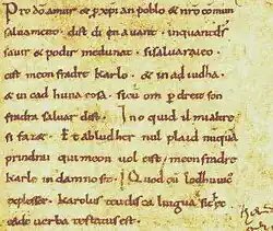 Pro Deo amur et pro christian poblo et nostro commun salvament, d'ist di en avant, in quant Deus savir et podir me dunat, si salvarai eo cist meon fradre Karlo, et in aiudha et in cadhuna cosa. . .Por el amor de Dios y por el pueblo cristiano y nuestra salvación común, desde este día en adelante, siempre que Dios me diere sabiduría y poder, defenderé a mi hermano Carlos y le ayudaré en cualquier cosa...
