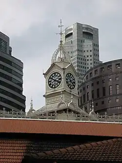 En el centro se coloca una linterna que permite que la luz del día ilumine el interior. La linterna está coronada por una torre de reloj instalada en 1991, y hay un conjunto de campanas que producen melodías chinas, malayas e indias. Las 23 campanas de bronce holandesas son tocadas por un jacquemart (figura de un golpeador de campanas) vestido como un coolie.[11]
