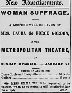 - ↑ a b «Overlooked No More: Laura de Force Gordon, Suffragist, Journalist and Lawyer». The New York Times (en inglés estadounidense). 9 de enero de 2019. ISSN 0362-4331. Consultado el 10 de enero de 2019.