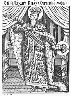 San Lazar fue venerado en la corte del zar Iván IV de Rusia, cuya abuela materna nació en la noble familia serbia de Jakšić.[62] Lazar aparece en un fresco en la catedral del Arcángel Miguel, el lugar de entierro de los monarcas rusos en el Kremlin de Moscú. Las paredes de la catedral fueron pintadas en 1565 con frescos que muestran a todos los gobernantes rusos que precedieron a Iván IV. Solamente se representaron cuatro no rusos: el emperador bizantino Miguel VIII Paleólogo y tres serbios: los santos Simeón, Sava y Lazar. El príncipe también está representado en la Crónica Ilustrada de Iván el Terrible, en sus nueve miniaturas que representan la batalla de Kosovo.[63] Es en este libro ruso que por primera vez se menciona al príncipe Lazar como zar. Alrededor de 1700, el conde Đorđe Branković escribiría sus Crónicas eslavo-serbias, en las que afirmaba que Lazar fue coronado zar. Esto influiría en la tradición popular serbia, en la que el príncipe es conocido hoy en día como el zar Lazar.[64] Después de la muerte de Iván IV, Lazar rara vez es mencionado en las fuentes rusas.[63]
