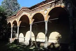 El edificio situado en el número 5 de la calle fue concedido desde 1974 a la iglesia ortodoxa griega y comprende un tramo correspondiente a poco más de cinco estancias originarias, con seis ventanas y cinco chimeneas. En el lado del edificio opuesto a la calle se conserva un tramo del pórtico con diez arcos sobre once columnas. También hay una placa que reza: O viandante, il passo trattieni ma non il pianto («Oh caminante, contienes el paso pero no el llanto»).[32]