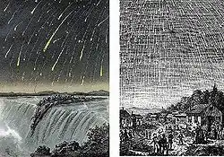 El 13 de noviembre de 1833 la costa este de Estados Unidos estuvo iluminada durante más de seis horas debido a las Leónidas. Iniciada poco antes de la medianoche, Olmsted, de Boston, dijo que «su número era como la mitad de los copos de nieve que se observan durante una nevada», y contó más de 240 000 meteoros. A partir de este acontecimiento se cambió la forma de observar las lluvias de estrellas.[7]