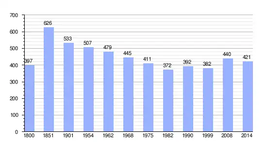 Los datos demográficos contemplados en este gráfico de la comuna de Le Bourg-Saint-Léonard[4] se han cogido de 1800 a 1999 de la página francesa EHESS/Cassini, y los demás datos de la página del INSEE.[5]