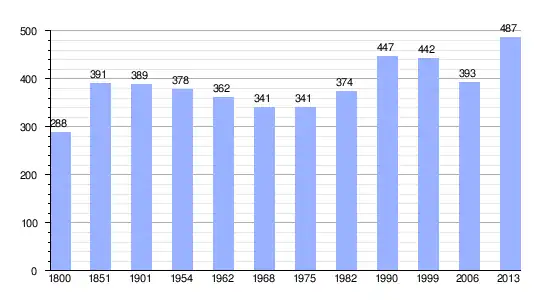 Los datos demográficos contemplados en este gráfico de la comuna de Le Breuil-sous-Argenton[4] se han cogido de 1800 a 1999 de la página francesa EHESS/Cassini, y los demás datos de la página del INSEE.[5]