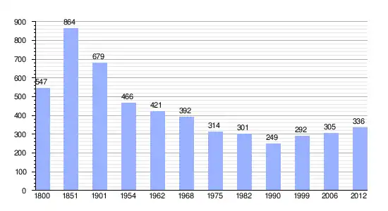 Los datos demográficos contemplados en este gráfico de la comuna de Le Guédeniau[5] se han cogido de 1800 a 1999 de la página francesa EHESS/Cassini, y los demás datos de la página del INSEE.[6]