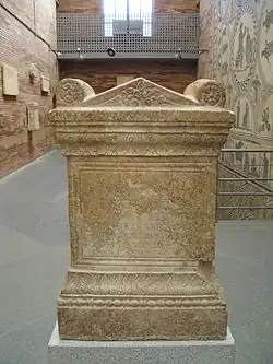 Tegula procedente del castra legionis de la Legio VII Gemina en la ciudad de León, conservado en el Museo de San Isidoro de León, en el que aparece el sello de la unidad como L(egio) VII G(emina) GOR(diana) P(ia) F(idelis) (238-244) | ||