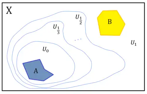 En topología, el lema de Urysohn es un lema que establece que un espacio topológico es normal si y sólo si cualquier par de conjuntos cerradosdisjuntos pueden ser separados por una función continua.[1]Esto es, en un espacio topológico es equivalente que los conjuntos cerrados disjuntos se puedan separar por entornos disjuntos a que se puedan separar por una función continua (existe una función continua del espacio a que en un conjunto vale 0 y en el otro 1).