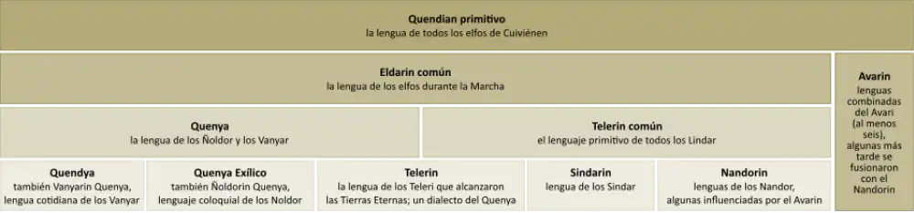 Tolkien inventó dos subfamilias (subgrupos) de los idiomas elfos. "El lenguaje de los Quendelie (Elfos) se hundió muy pronto en las ramas del Eldarin y el Avarin".[8]