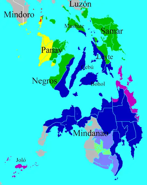 - cebuano: es una única lengua hablada en las Bisayas Centrales, gran parte de las Bisayas Orientales y amplias zonas de Mindanao;