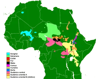 berta (G) fur (D) gumuz (J) kadu (L) komano (I) kuliak (K) kunama (H) maba (C) sahariano (B) songai (A) sudánico central (F) sudánico oriental (E) | |
