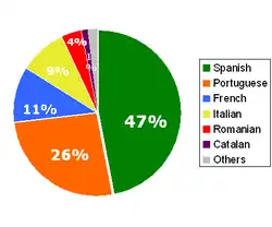 Las siete lenguas romances más habladas por número total de hablantes son el español (600 millones),[1][2] el francés (321 millones),[3] el portugués (283 millones), [4] el italiano (71 millones), [5] el rumano (28 millones),[6] el criollo haitiano (13 millones),[7] el catalán/valenciano (10 millones)[8][9][10] y el gallego (3 millones). No obstante, el número de lenguas romances conocidas supera la veintena, aunque en la actualidad muchas variedades regionales están gravemente amenazadas y solo media docena de ellas tienen un uso general y varios millones de hablantes.