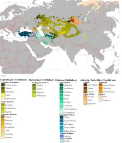 - ↑ El tártaro de Crimea el urum históricamente son lenguas del grupo kipchak, que ha sufrido una fuerte influencia del grupo oghuz.