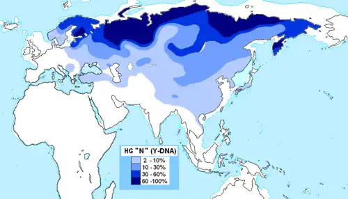 ![]() Distribución actual de las lenguas urálicas y yucaguiras.