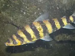 Alcanza una longitud de 25 cm.[4][3] Es de color amarillo ocre, con 9 bandas verticales negras, 8 en el cuerpo y otra en el espacio interorbital,[1] además de una mancha sobre el hocico. Tiene la aleta caudal redondeada.[4]