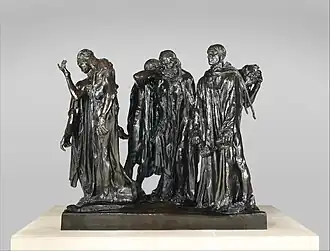 En el otoño de 1884 la municipalidad de Calais retomó un proyecto que se había gestado varias décadas atrás: la creación del monumento como homenaje a Eustache de Saint-Pierre y los ciudadanos ilustres. El escultor Auguste Rodin recibió en 1885 el encargo de crear este monumento conmemorativo, pocos años después de otro acontecimiento histórico que puso en entredicho la soberanía gala: la guerra franco-prusiana (1870-1871) entre las tropas de Napoleón III y el Canciller de Hierro, Otto von Bismark.[2] Después de casi cuatro años de trabajar en bocetos, la escultura estuvo lista en 1888 con figuras de casi dos metros de altura, para finalmente ser inaugurada en 1895, once años después de que Rodin presentara la primera maqueta. En palabras de John L.Tancock, logró evitar los estereotipos de la escultura académica, creando un monumento que todavía inspira y conmueve al espectador contemporáneo.[3]