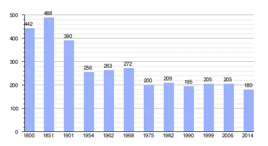 Los datos demográficos contemplados en este gráfico de la comuna de Les Champs-de-Losque[4] se han cogido de 1800 a 1999 de la página francesa EHESS/Cassini, y los demás datos de la página del INSEE.[5]