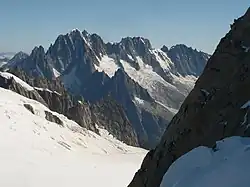 ![]() Las Aiguilles du Dru (a la izquierda), la Aiguille Verte (en el centro) y Les Droites (a la derecha, sobre el fondo) | ||