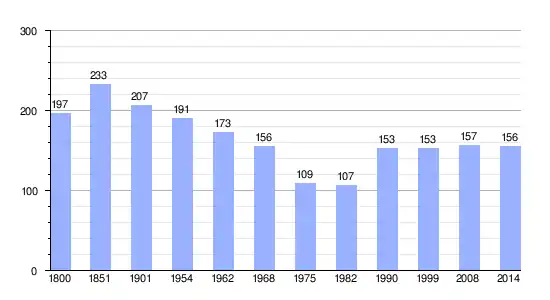 Los datos demográficos contemplados en este gráfico de la comuna Les Essards[4] se han cogido de 1800 a 1999 de la página francesa EHESS/Cassini, y los demás datos de la página del INSEE.[5]