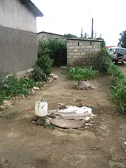 Una letrina de hoyo bien mantenida en un hogar rural cerca de Maseru, Lesoto. -
