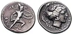 Otra versión, la de Diodoro de Sicilia, fue un príncipe sicanio que entabló combate con Hércules cuando este pasó por Sicilia, de regreso del país de Geriones. En el combate Leucaspis murió junto con un gran número de nobles compatriotas, por lo que se le rindieron honores divinos.[1]