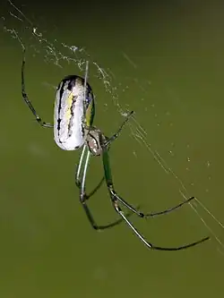 Es una araña perteneciente a la familia Tetragnathidae, cuyos miembros son conocidos comúnmente como “arañas de quelíceros alargados”, y pertenece al orden Araneae. La coloración es muy llamativa, el prosoma es verde claro, con líneas verde oscuras por los lados y una en la parte central, la cual muestra una depresión, presenta ocho ojos; los dos primeros pares de patas son más alargados que los dos restantes, siendo el tercero el más corto, su coloración es verde intenso, con las articulaciones oscuras; el opistosoma se encuentra muy decorado, predomina el color plateado, pero se observan vivos verdes, naranjas y amarillos por los lados, en la parte ventral presenta una mancha anaranjada brillante.[1][5] Es considerada un buen agente biológico de control de plagas. Se les puede hallar en el centro de la telaraña que construyen, generalmente de cabeza, dejando el vientre hacia arriba.