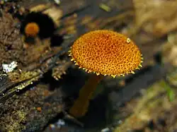 capuchón bajo las escamas.[11] En Phaeomarasmius erinaceellus, el tamaño total es menor -diámetro del capuchón de 1 a 4 cm- y las esporas son de color marrón canela.[15] Algunas especies del género Cystoderma también parecen similares, pero pueden distinguirse por características microscópicas, como la presencia de células esféricas (en lugar de en forma de garrote) en la cutícula del sombrero, y también por su hábitat ya que Cystoderma suele crecer en el suelo, no en la madera.[16]
