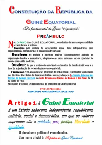 ![]() Primeras partes, el preámbulo y el primer artículo de la Constitución de Guinea Ecuatorial en portugués, uno de los idiomas oficiales del país | ||