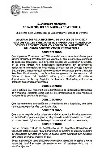 11. «ACUERDO SOBRE LA NECESIDAD DE UNA LEY DE AMNISTÍAPARA LOS CIVILES Y MILITARES QUE APEGÁNDOSE AL ARTÍCULO 333 DE LA CONSTITUCIÓN, COLABOREN EN LA RESTITUCIÓNDEL ORDEN». www.asambleanacional.gob.ve. Consultado el 29 de enero de 2019.