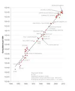 La ley de Koomey describe una tendencia de largo plazo en la historia de equipamiento computacional. El número de computaciones por joule de energía disipada se ha venido doblando aproximadamente cada 1,57 años. Esta tendencia ha sido extraordinariamente estable desde los 1950s (R2 de más del 98%) y de hecho ha sido un poco más rápida que la ley de Moore. Jonathan Koomey articuló la tendencia como sigue: «Para una carga computacional fija, la cantidad de batería que necesitas caerá por un factor de dos cada año y medio».[1]