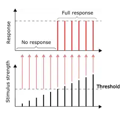 - Esta obra contiene una traducción derivada de «All-or-none law» de Wikipedia en inglés, concretamente de esta versión, publicada por sus editores bajo la Licencia de documentación libre de GNU y la Licencia Creative Commons Atribución-CompartirIgual 4.0 Internacional.