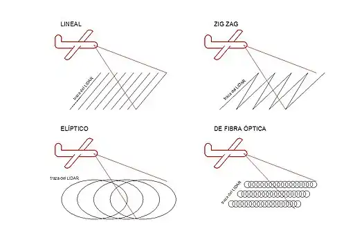- Zigzag. En este caso el espejo es rotatorio en dos sentidos (ida y vuelta). Produce líneas en zigzag como patrón de escaneado. Tiene la ventaja de que siempre está midiendo pero al tener que cambiar de sentido de giro la aceleración del espejo varía según su posición. Esto hace que en las zonas cercanas al límite de escaneado lateral (donde varía el sentido de rotación del espejo), la densidad de puntos escaneados sea mayor que en el nadir.