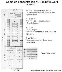 Había más de un centenar de prisioneros en la cabaña número 6, donde estaban encerrados prácticamente las 24 horas, tenían el derecho de salir solo una media hora por día, bajo vigilancia. Durante toda el día los prisioneros clasifican los cartuchos y de las piezas de radio. Los prisioneros políticos o de derecho común alemanes de la otra mitad del campo estaban obligados a trabajar en condiciones espantosas en las canteras de turba de los alrededores. La alimentación era sí pobre que los prisioneros perdían un promedio de 4 kg cada mes.