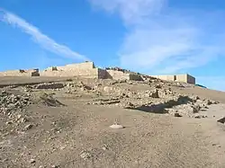 - El “castillo”[38] se levanta en la cúspide del cerro, a unos 1000 m sobre el nivel del mar, ejerciendo un control visual de largo alcance. El edificio presenta una planta cuadrangular de 13 m de lado, y se desarrolla en varias plantas de techo abovedado comunicadas entre sí por una escalinata que circula por el interior de los muros perimetrales.[39] La técnica de construcción es el encofrado, con paramentos externos de mampuesto (a base de piedra caliza, arenisca, y toba, reutilizada de los monumentos romanos) y un mortero hecho con aglomerante de cal y un árido silíceo de color anaranjado bastante grosero, y pequeños guijarros. La parte interna de las gruesas paredes se rellena con el mismo tipo de argamasa, aunque las piedras ya no aparecen colocadas de forma tan regular. El edificio se encuentra inmerso en un proyecto de consolidación y puesta en valor.[40][41]